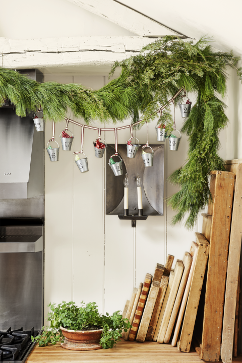 Haven’t purchased an advent calendar yet? Then you’ve got the perfect excuse to craft one. The idea pictured here is beyond easy: Simply string together some galvanized pails, fill them with trinkets, and affix them to a garland.